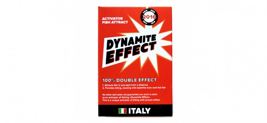 Активатор клева Dynamite Effect считается более усовершенствованным вариантом по сравнению с предыдущими активаторами. Разработчики учли все недостатки и улучшили формулу действующего вещества. В состав препарата входит рыбная мука, пряности, вкусовые добавки, и аттрактанты.