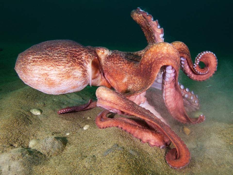Осьминогов от других моллюсков отличает не только ряд щупалец, но и особая интеллектуальность — у многих видов объём мозга почти такой же, как и объём тела.