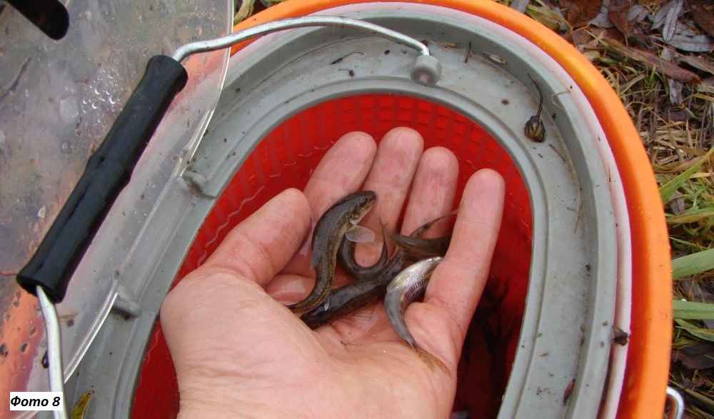 Для поплавочной ловли окуня, я считаю, самый оптимальный живец – это небольшой пескарь или уклейка (фото 8). Подойдет также небольшая плотвичка или красноперка. Как правило, малька для ловли полосатого мы цепляем под губы (фото 9). В таком положении живчик долгое время остается подвижным и активным.