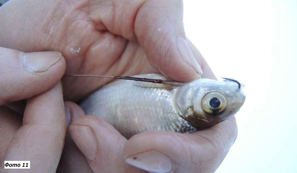 Летом же такой вольности нет — и хорошо, если, клюнув, щука юркнула в прибрежную растительность, но если она решила поскорее уйти от вас в сторону, то тут уж остается надеяться на удачу, делая подсечку в надежде, что ваш тройник сумеет зацепить щуку. Вот для подобных случаев есть и другой вариант насаживания живца при ловле на поплавочную удочку – под жабры. Заводите конец поводка под жаберную крышку, выводите в рот и цепляйте к нему двойник, помещая его в рот живца (фото 11).