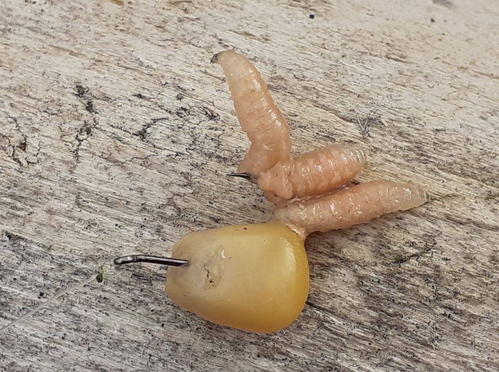 В воде такой «бутерброд» эффективен потому, что червь активно шевелится, плюс приманивает рыбу своим запахом, а кукуруза кроме приятного сладкого аромата еще имеет яркий цвет, издалека заметный для рыбы.
