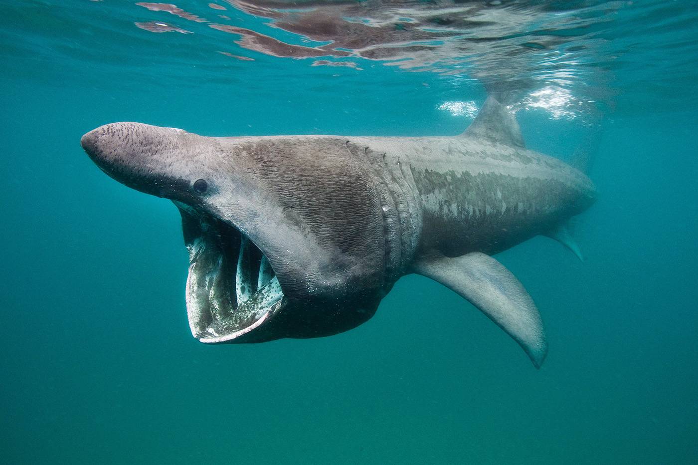 Форма тела гиганта напоминает сигару, а открытая пасть похожа на пещеру метровой ширины. Голову, как будто воротник, обрамляют жаберные щели с тысячью тычинок, образующих цедильный аппарат.