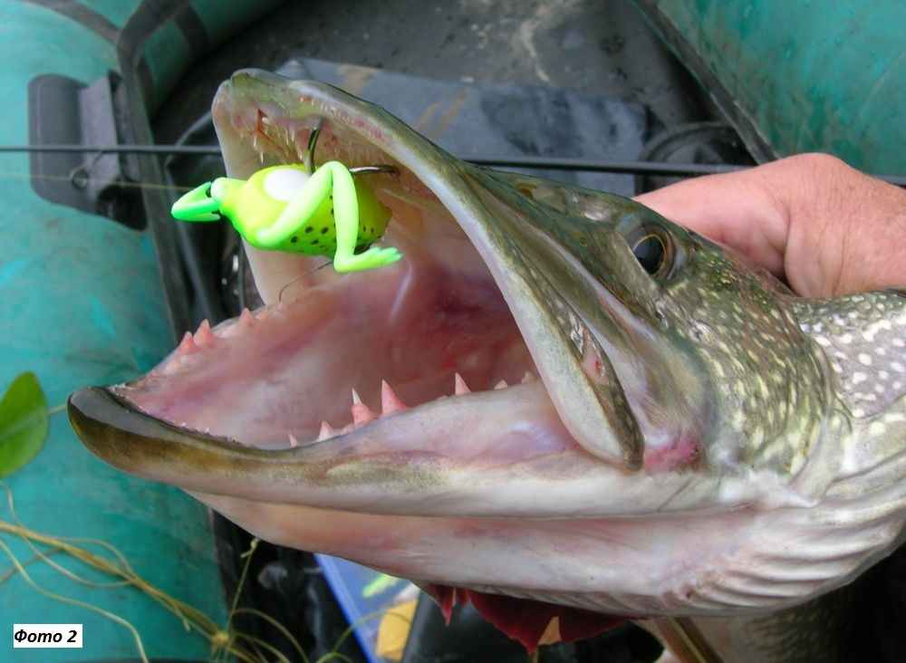 Зацепов – даже с дополнительным крючком – у «лягушки» практически не бывает, но снасть необходима достаточно мощная и с соответствующим шнуром (у меня не менее 20 lb), поскольку щука при засечке пытается уйти в заросли травы и закручивает шнур вокруг стеблей кувшинки или корней телореза. Полностью согласен с теми, кто рекомендует выдерживать еще и паузу в пару секунд после хватки щуки – подсечка становится результативнее.