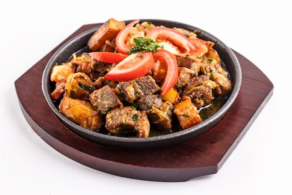 Тебе понадобится: 1 кг говядины, 1 кг картофеля, 3 луковицы, 6 помидоров, по 1 пучку базилика, кинзы и укропа, 5 зубчиков чеснока, 600 мл растительного масла, хмели-сунели, паприка и специи.