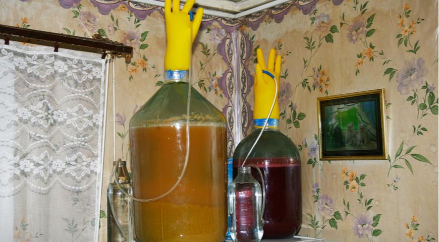 - Накрыть бутыль крышкой с гидрозатвором или натянуть на ее горлышко резиновую медицинскую перчатку с проколотой в пальце крохотной дырочкой и поставить ее в помещение, где происходило предварительное брожение.