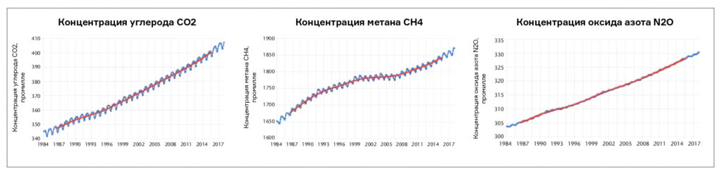 Как менялась концентрация основных парниковых газов за 1984–2017 годы. Источник