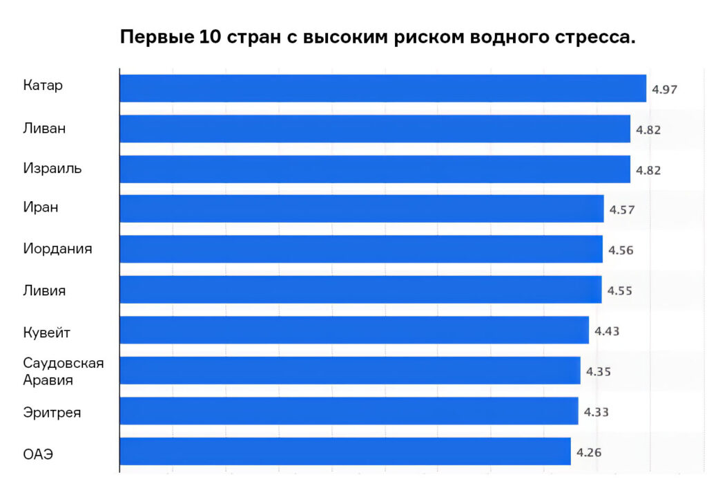 Катар, Ливан, Израиль, Иран, Иордания. Более 25% населения Земли сталкивается с чрезвычайно высокой водной нагрузкой в своих странах. Водный стресс — это нехватка достаточного количества пригодной воды для использования всеми людьми в стране, включая питьевую. Причины — сельское хозяйство и обеспечение нужд промышленности. Дефицит воды есть в Южной Азии, на Ближнем Востоке, в Северной Африке и гораздо менее распространен в Европе.