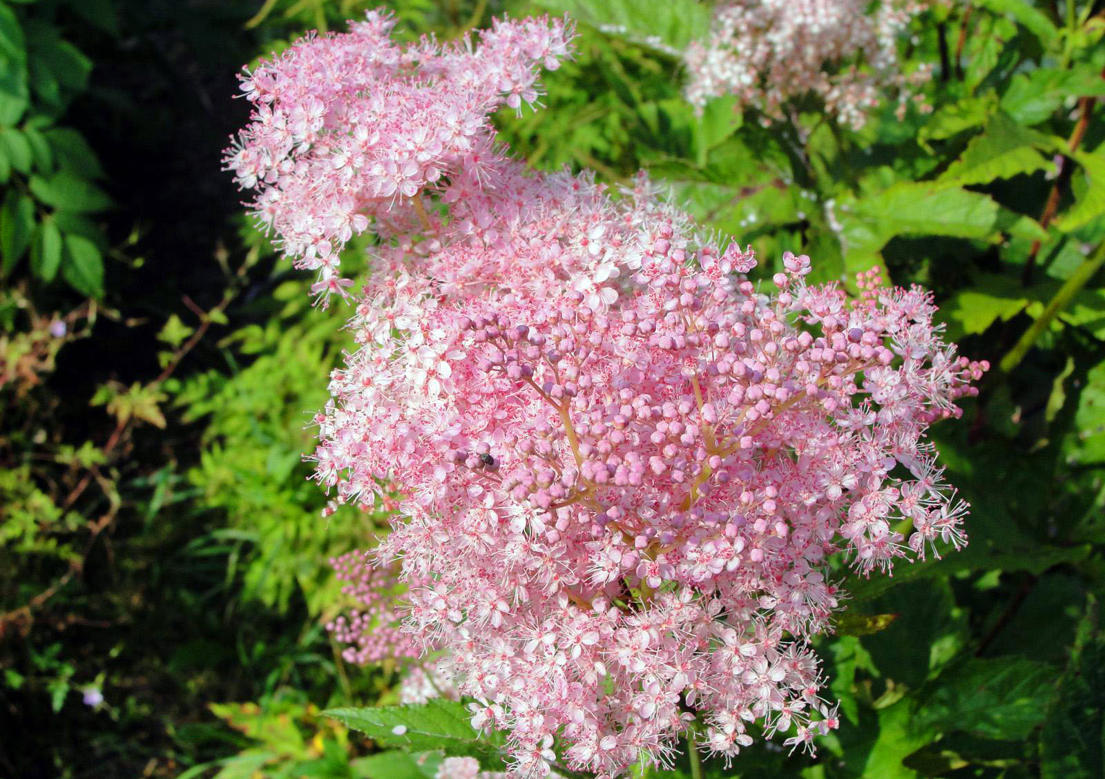 Лабазник вязолистный или таволга (Filipendula ulmaria) — семейство Розовые, имеет прямостоячий стебель, достигающий двух метров. Темно-зеленые крупные трехлопастные листья снизу опушены. При растирании издают характерный огуречный запах. Соцветие — прямостоячая метелка из множества мелких цветков бело-розовых или бледно-желтых. Цветет в середине лета. Обладает очень сильным ароматом. Толстое, ползучее корневище к августу образует новые побеги. Лабазник — холодостойкое и влаголюбивое растение. Распространен в лесах и лесостепях, во влажных местах. Отличный медонос. Является лекарственным растением.