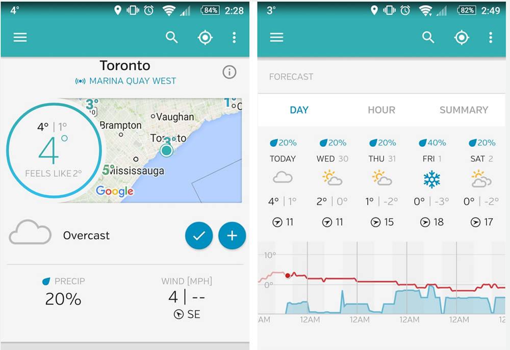 1Weather уже давно завоевал популярность пользователей благодаря своему простому привлекательному интерфейсу и огромному количеству данных о погоде. Программа предоставляет краткие сводки текущих погодных условий и прогнозов, а также почасовые, 10-дневные и 12-недельные прогнозы. В дополнение к прогнозам, 1Weather также предлагает подробные спутниковые карты с фильтрами данных, виджетами, уведомлениями и предупреждениями о надвигающихся ураганах.