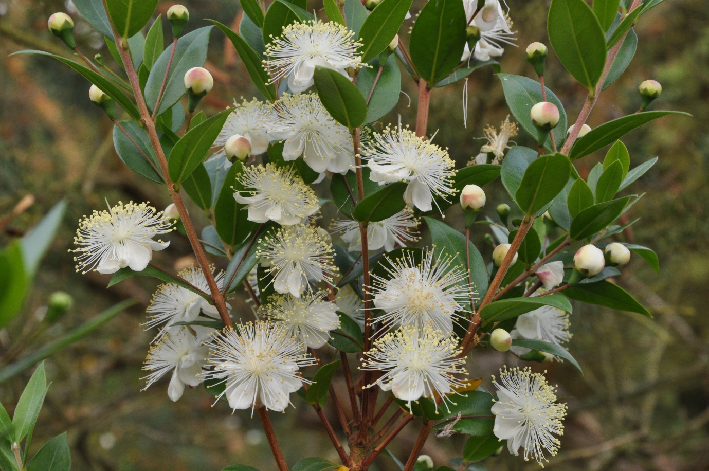 Мирт – растение вечнозеленое. Его листья цельные, расположены супротивно. Цвет листовых пластин изумрудный, на поверхности хорошо различимы тонкие прожилки, в которых и содержится эфирное масло, обладающее удивительным ароматом.