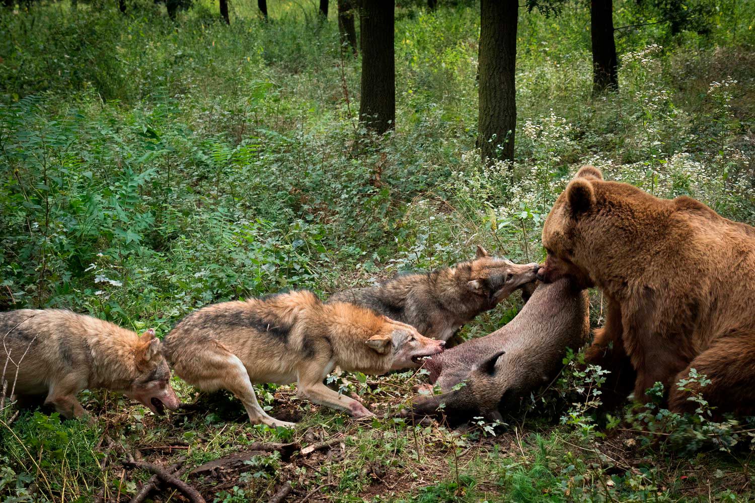 Если пищи мало, звери довольствуются молодыми побегами и останками погибших млекопитающих. Иногда они разоряют гнезда птиц и охотятся на оленей, лосей и косуль, нападают на домашних животных.