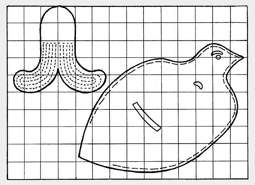 По выкройкам-шаблонам вырезают заготовки (две верхних половинки и две нижних), накладывают соответственно сначала две верхних обратной стороной и сшивают вместе, начиная от основания носика через головку до основания хвостового пера, соответственно от основания носика к середине грудки (рис. 5). <o>