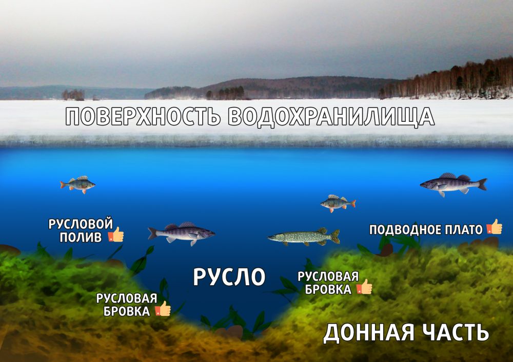 Попробую разобраться, почему хищница старается придерживаться в это время в основном глубоководных участков водохранилищ. В декабре – январе, в зависимости от погодных условий, формирующих климат в течение всего сезона на конкретном водоеме, именно в его русле и недалеко от него складывается наиболее подходящие условия для дальнейшего развития рыб большинства видов.