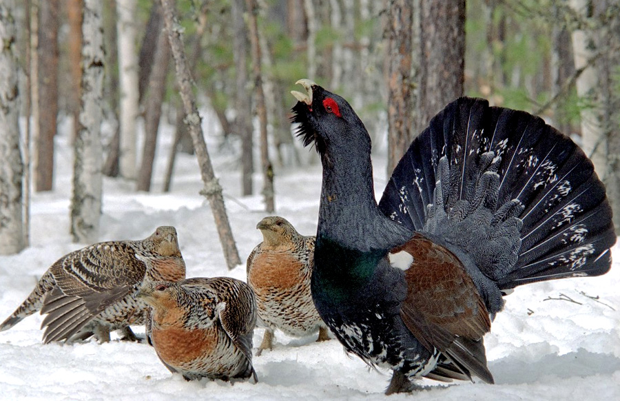 У глухарей с наступлением весны набухают брови и на время окрашиваются в красный цвет.