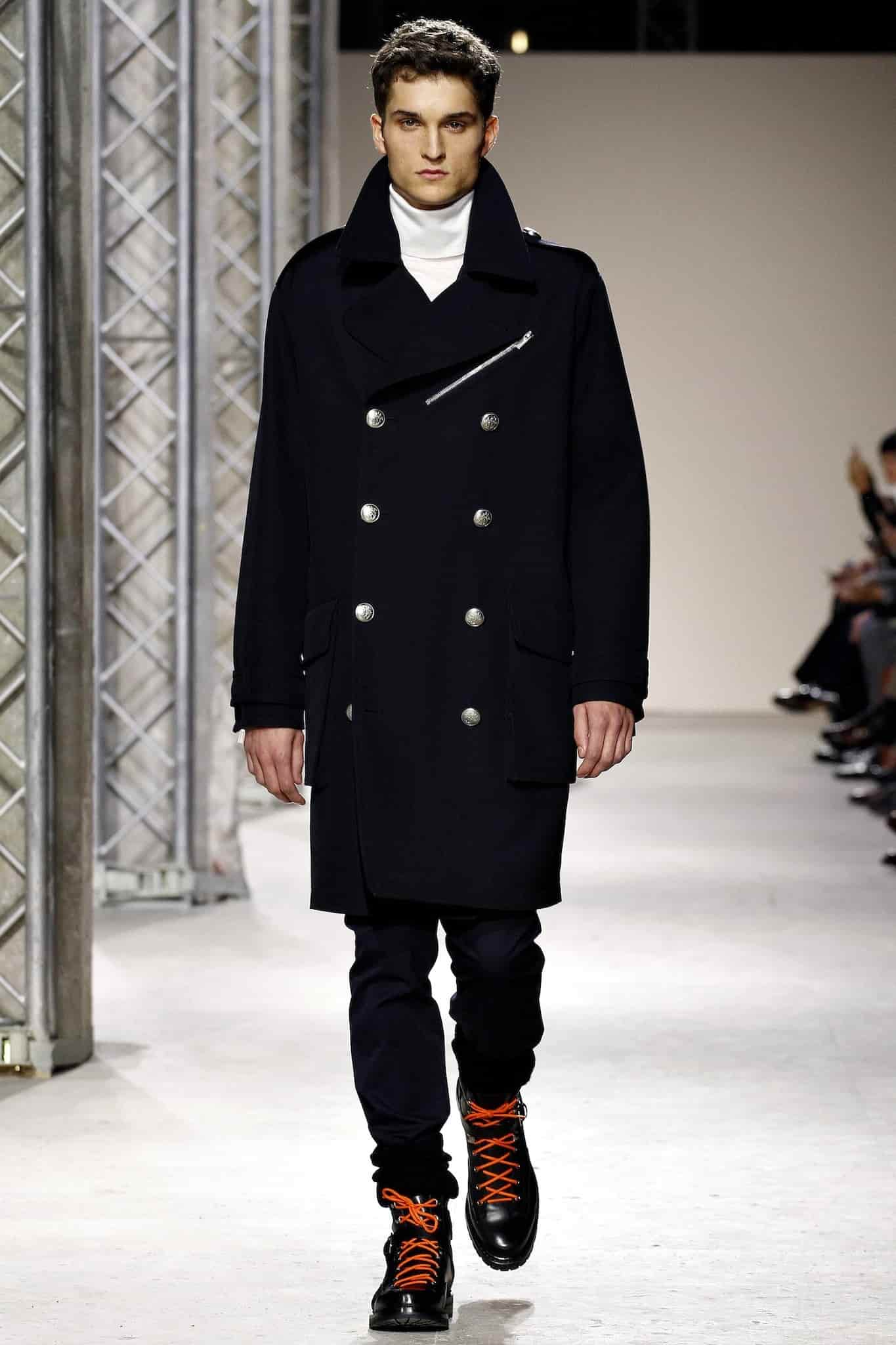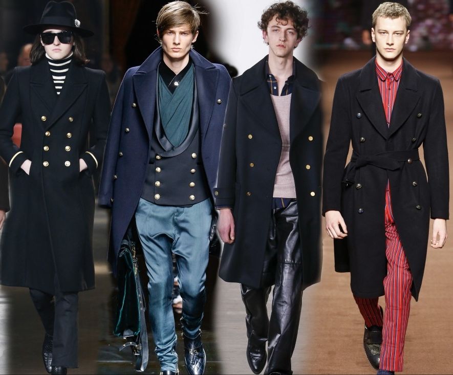 Пальто в военном стиле также невероятно популярны среди мужчин. В нынешнем сезоне стилисты рекомендуют выбирать удлиненные, двубортные модели, напоминающие кроем бушлат моряка. Такой фасон не всегда удобен, поскольку в длинном пальто некомфортно ходить, поэтому сегодня не менее популярны модели до середины бедра.